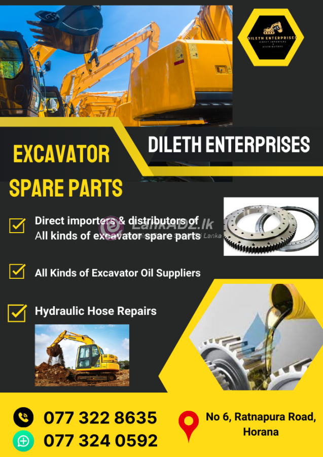 දිලෙත් එන්ටප්රයිසස්, ශ්රී ලංකාවේ ප්රමුඛපෙලේ එක්ස්කැවේටර් අමතර කොටස් ආනයනය කර බෙදාහරින සමාගමකි. හොරණ, රත්නපුර පාර අංක 9 ස්ථානයේ පිහිටා ඇති අපගේ අලෙවිසලින් ඔබට අවශ්ය එක්ස්කැවේටර් යන්ත්ර සදහා අමතර කොටස් සහ එක්ස්කැවේටර් ලිහිසි තෙල් අවම මිලගනන් යටතේ මිලදී ගතහැක. එමෙන්ම එක්ස්කැවේටර් හයිඩ්රොලික් හෝස් අලුත්වැඩියා කිරීමද අප විසින් සිදුකරනු ලැබේ.