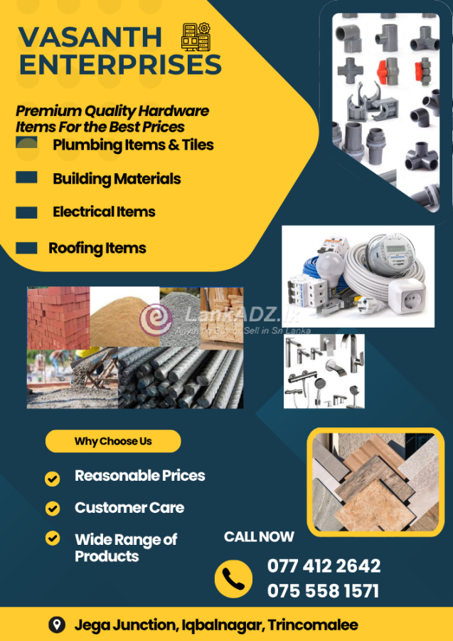 Vasanth Enterprises, a leading hardware store in Trincomalee on Nilaveli Road at Iqbalnagar, offers a vast selection of hardware. They provide construction materials, plumbing and electrical items, light fittings, tiles and bathware, power tools, concrete products, and garden paving. Enjoy competitive rates and transport to your construction site.